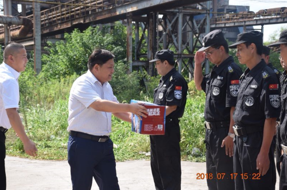 7月17日,保安集团督查总监、特卫分公司总经理姜云慰问特卫队员,为炎炎夏日奋斗在一线岗位的保安员送去防暑降温物品。姜云对不畏高温、坚守岗位的一线工作者表示感谢,并叮嘱公司要重视防暑降温工作,给战斗在一线的员工创造良好的工作环境。