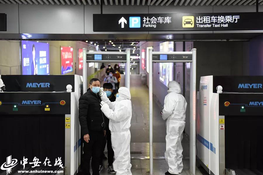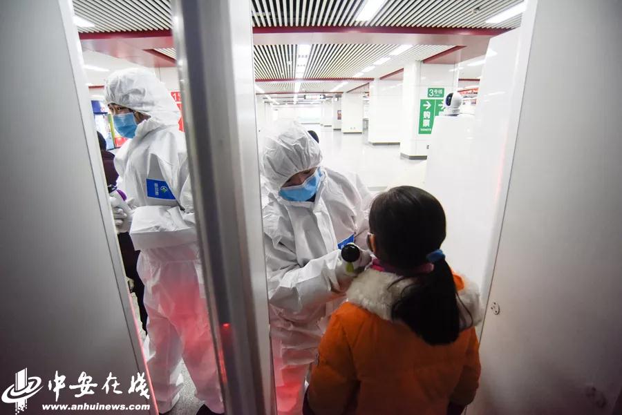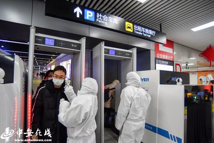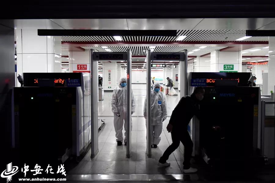 1月27下午开始,在地铁合肥火车站、高铁南站、汽东站、汽车西站站点,安检人员首次配备隔离服检测进站乘客体温。