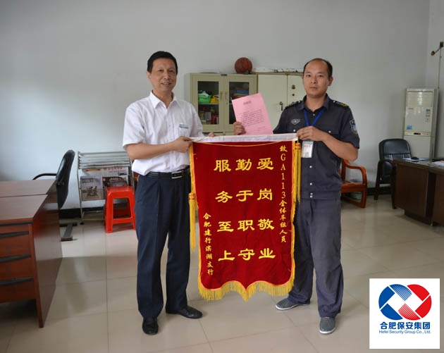 因中国建行银行滨湖支行,地处偏远地区,业务繁忙,经常无法准点交接款箱,使负责接送款箱的建行中队GA113车组,不得不推迟交接时间,但不管天气是大风雨雪,还是炎热酷暑,GA113车组全体押运队员从无怨言、全年无休、耐心配合、全力支持滨湖支行的金融服务工作。为此,中国建设银行合肥市滨湖支行的两位工作人员,代表滨湖支行全体员工,向GA113车组表示真诚的感谢。