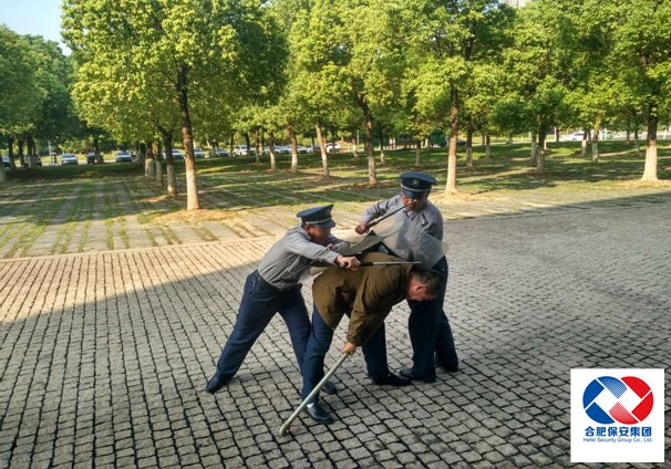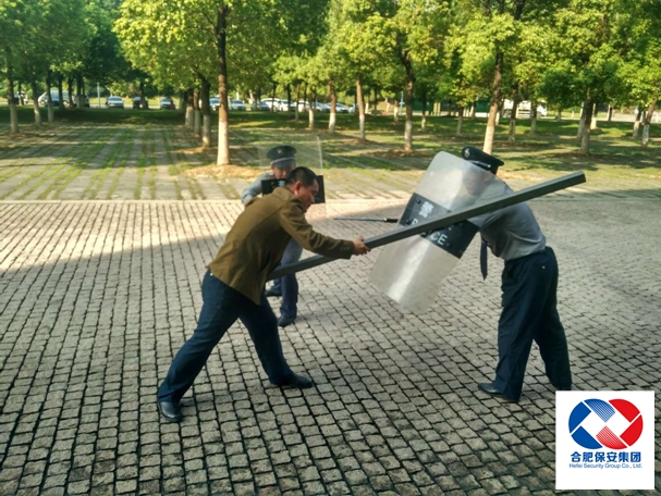 演练现场,一名保安队队长扮演恐怖人员,手持长棍,滋寻闹事,另两名保安人员,手持警棍、盾牌,进行防范反击。