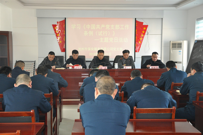 为使全体党员充分认识《中国共产党支部工作条例》对于加强新时代党的建设、巩固党的执政根基和全面从严治党的重大意义,2018年12月21日,池州市保安服务有限公司党支部召集全体党员对《中国共产党支部工作条例(试行)》进行了专题学习,会议由党支部副书记方勇军主持。